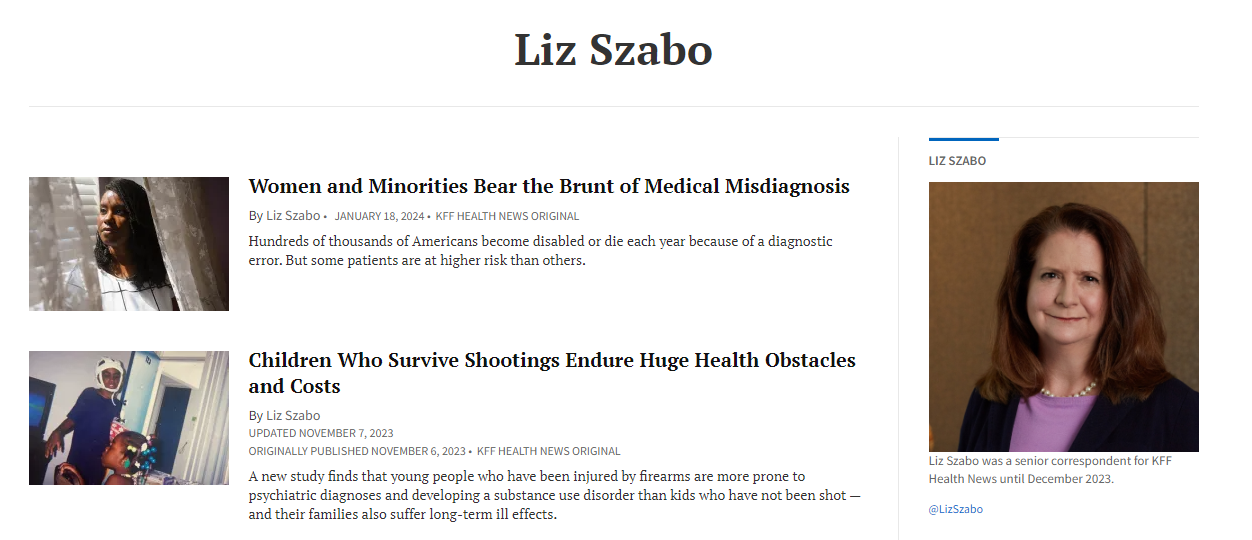 Liz Szabo is a senior correspondent for Kaiser Health News, where she covers cancer, end-of-life care, and other health-related topics. She has won numerous awards for her reporting, including the National Academies of Sciences, Engineering, and Medicine's Communication Award and the National Press Club's Consumer Journalism Award. Szabo's writing has appeared in USA Today, The Washington Post, and The New York Times, among other publications. She is known for her compassionate and nuanced reporting on the human impact of cancer and other serious illnesses.